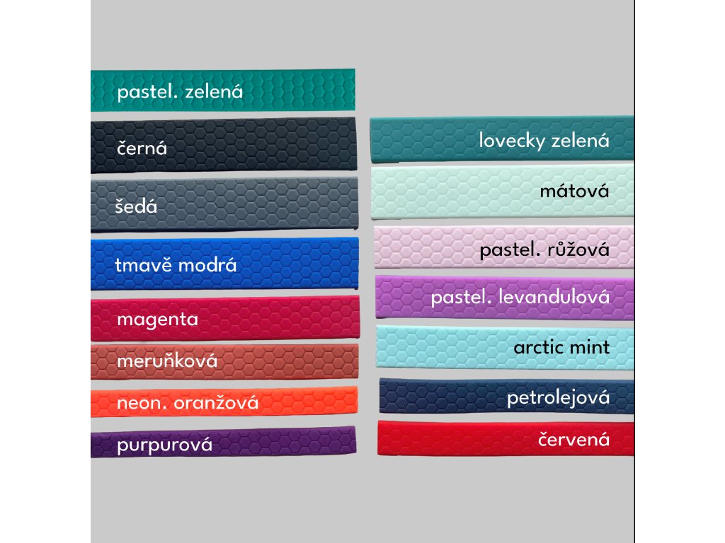 Odolný materiál: Popruh o šířce 16 mm s hexagonálním vzorem je vyroben z omyvatelného PVC/TPU materiálu. Je nenasákavý a k údržbě vám stačí jen mokrý hadřík.