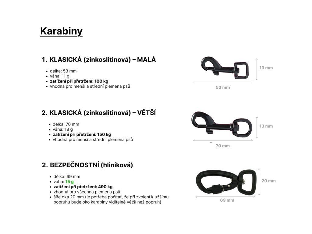 - Klasická karabina – větší má nostnost 150 kg, váží 18 g a je vyrobená ze zinkoslitiny; délka 70 mm; vhodná pro menší a střední plemena psů